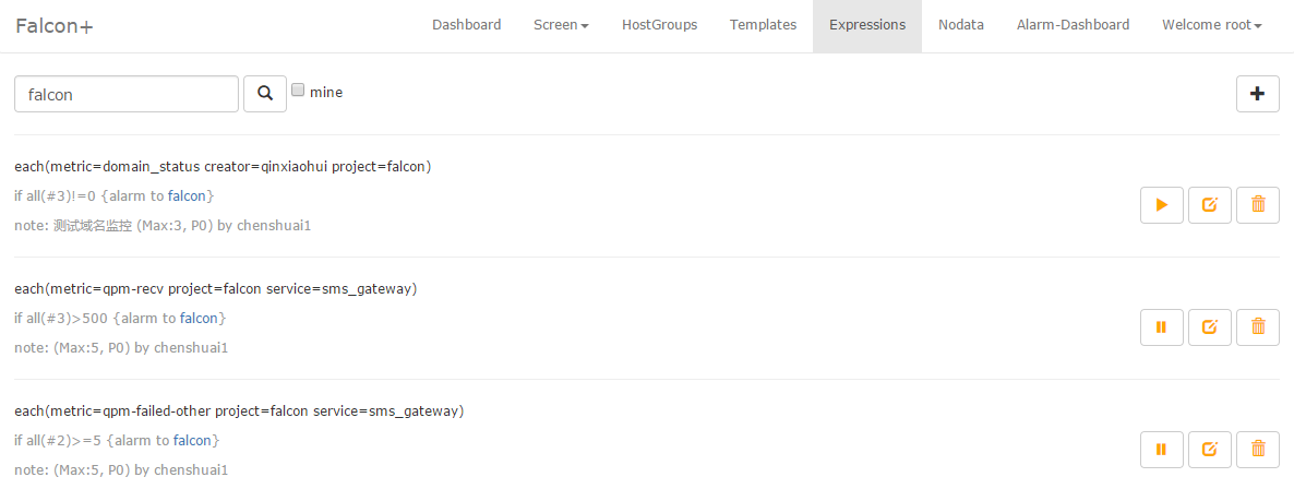 这是host group的管理页面,可以和服务树结合,机器进出服务树节点,相关的模板会自动关联或者解除。这样服务上下线,都不需要手动来变更监控,大大提高效率,降低遗漏和误报警。